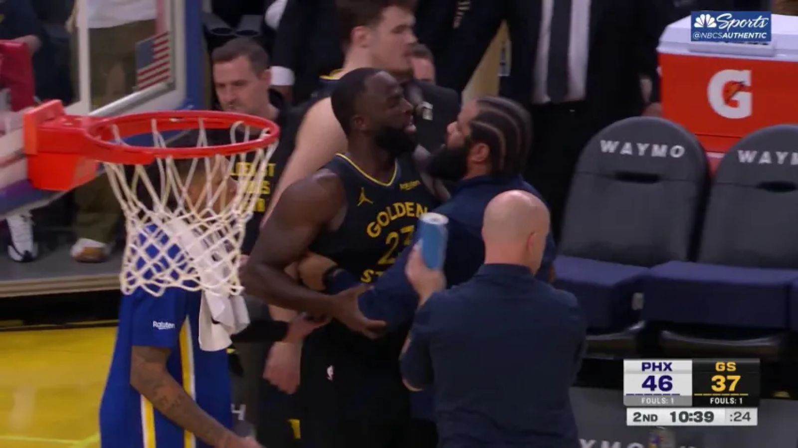 過去曾有多次情緒激動行為紀錄的 Draymond Green,在另一端蓋掉 Collin Gillespie 的切入並引發隨後的激烈爭執後,因從背後推了對方一把而領到第一次技術犯規。儘管隊友、勇士球團官員和保全人員試圖將他拉開,Draymond Green 仍持續抗議,隨後領到第二次技術犯規遭到驅逐。