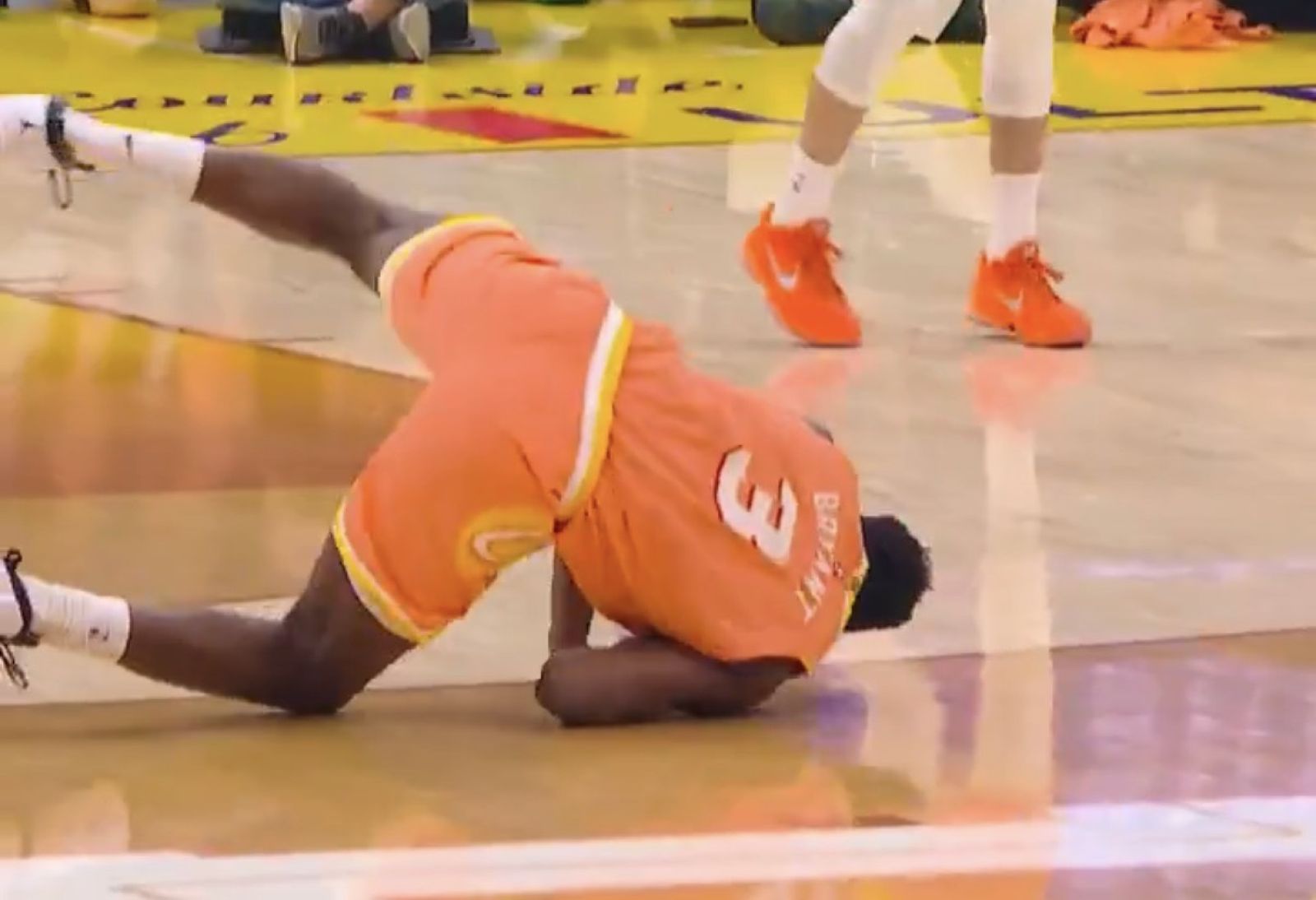 Thomas Bryant回防過程中比出了「Too Small」但隨即摔倒。圖/截自推特