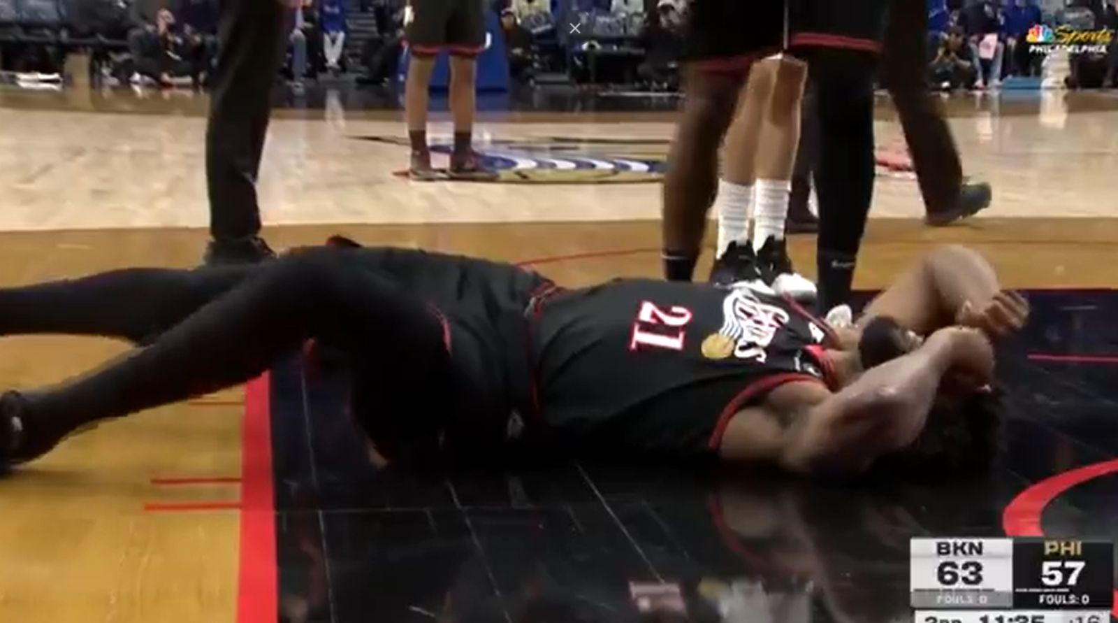 Joel Embiid於第三節因傷倒地。圖/截自推特