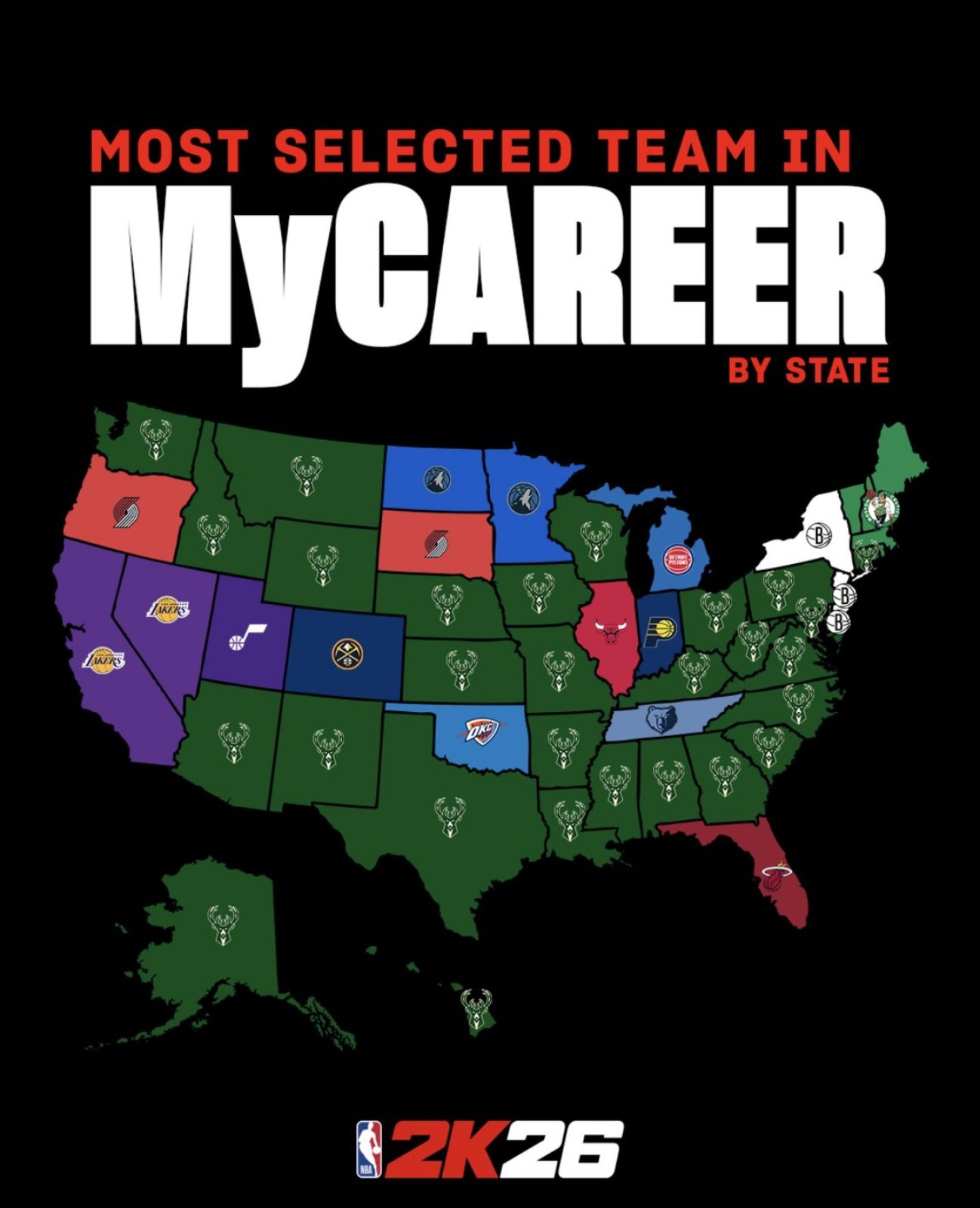 而據數據顯示,全美最多州選擇的則是密爾瓦基公鹿,包含美中、美東以及美西部分地區的玩家皆以公鹿為生涯模式起始的NBA球隊,其餘球隊則為湖人、拓荒者、灰狼、籃網、塞爾提克、爵士、灰熊、公牛、活塞與熱火。