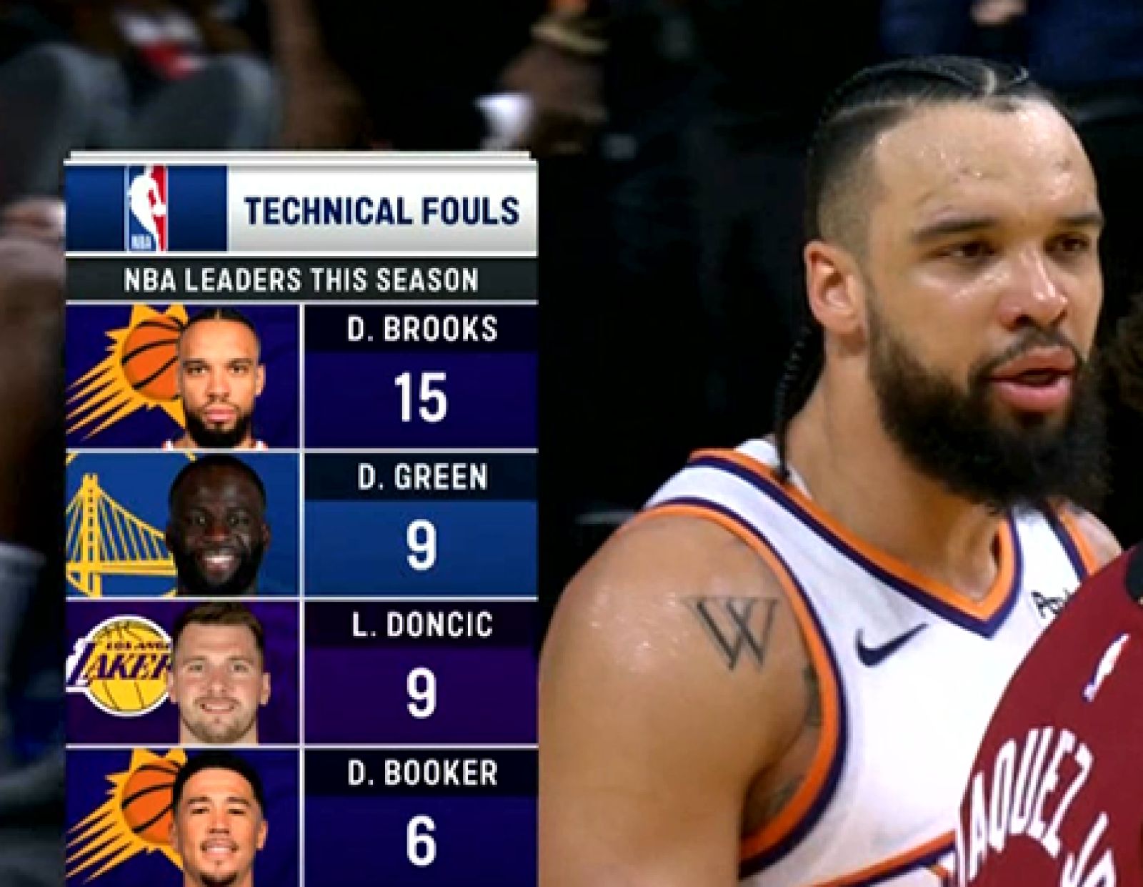 而轉播資訊也秀出了本賽季聯盟列出了本季至今獲得最多技術犯規的前四名球員,其中以Dillon Brooks(15次)位居榜首,Luka Doncic獲得10次位居第二(轉播資訊為9次,今對陣老鷹再獲得一次)、第三名為Draymond Green(9次),第四名則為Devin Booker(6次)。