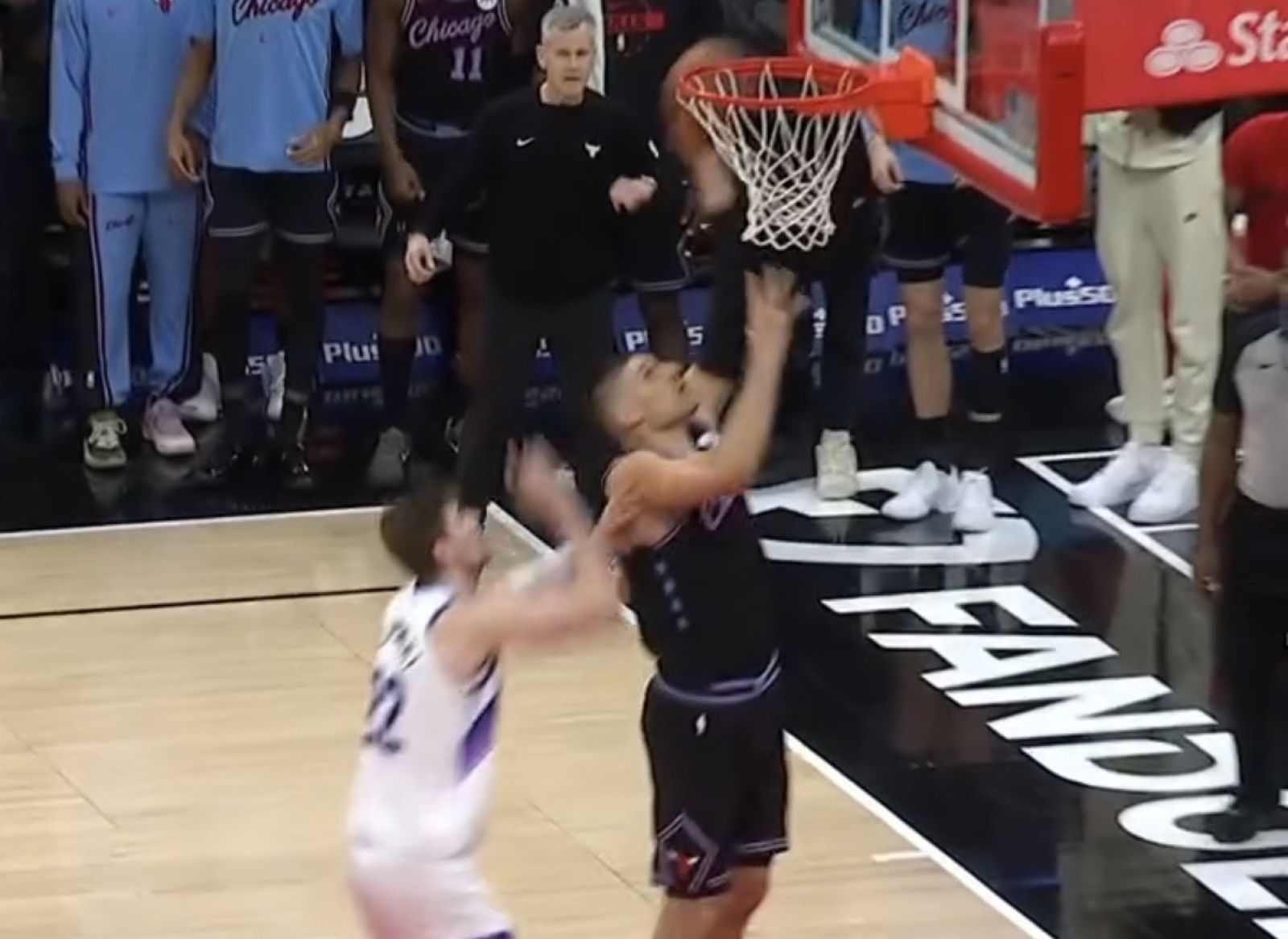 不過後續Isaac Okoro積極拼搶將球撥到Tre Jones手上,後續Tre Jones以不平衡的姿態傳球給在禁區出現空檔的Nikola Vucevic,最終Vucevic成功於籃下擺進兩分,讓公牛以128-126取得領先。