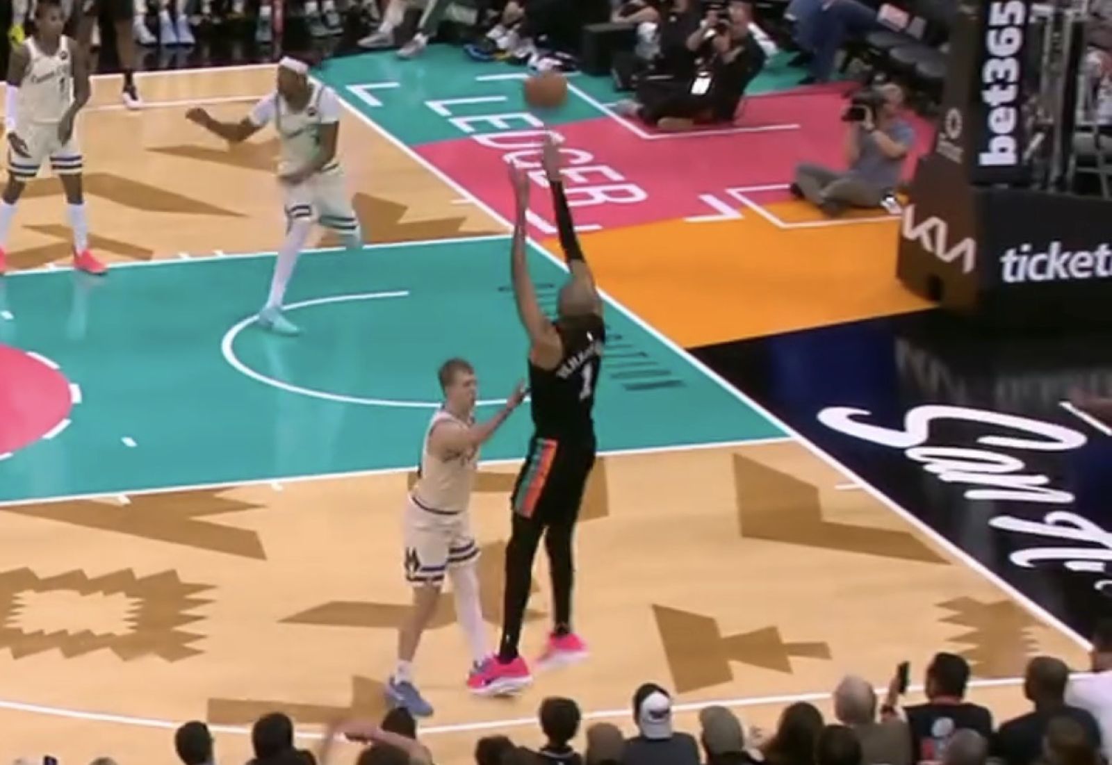 Victor Wembanyama以身高優勢與靈活性命鐘後仰三分跳投。圖/截自推特