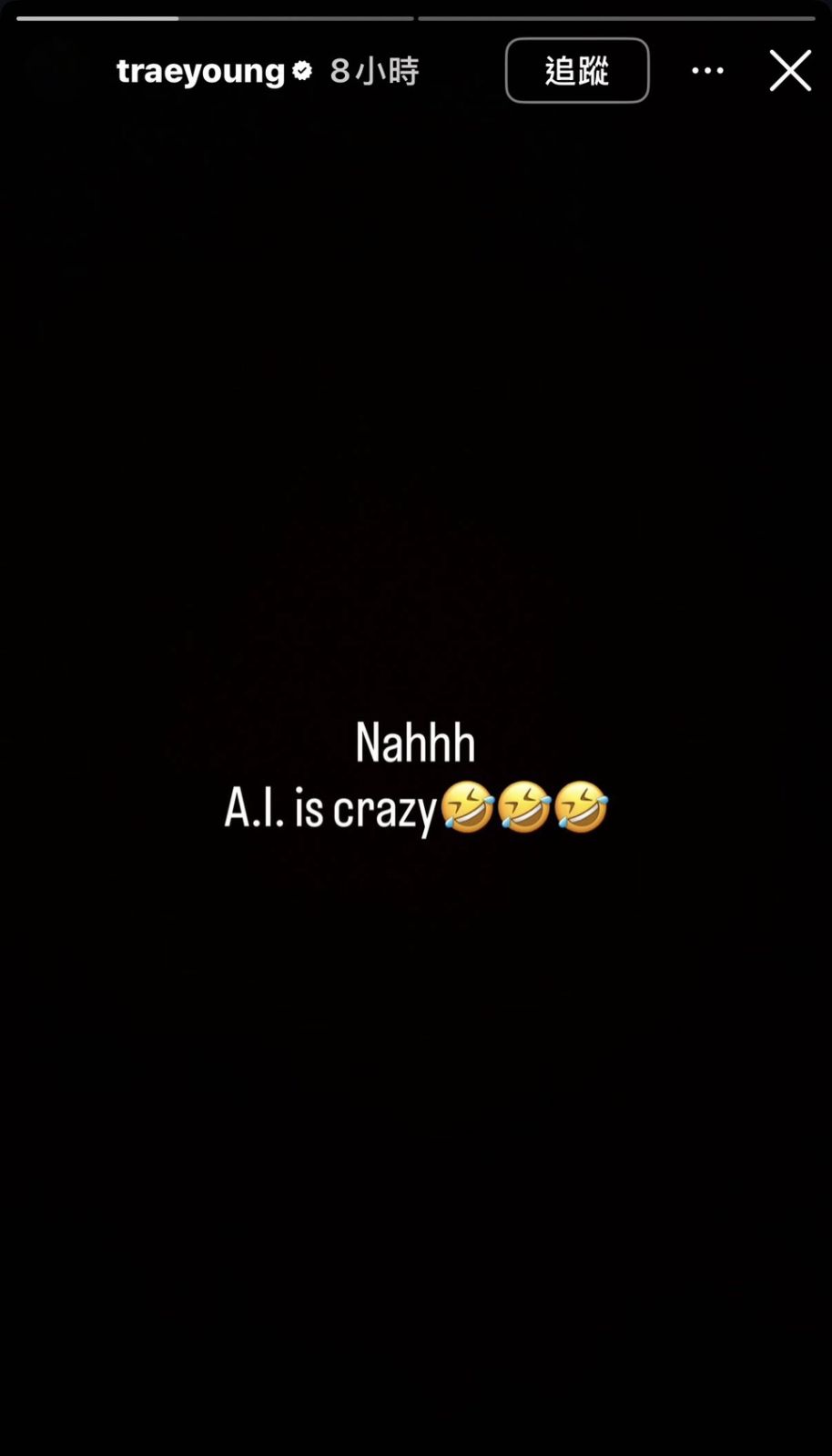 Trae Young發布限時動態表示AI太誇張了。圖/截自IG