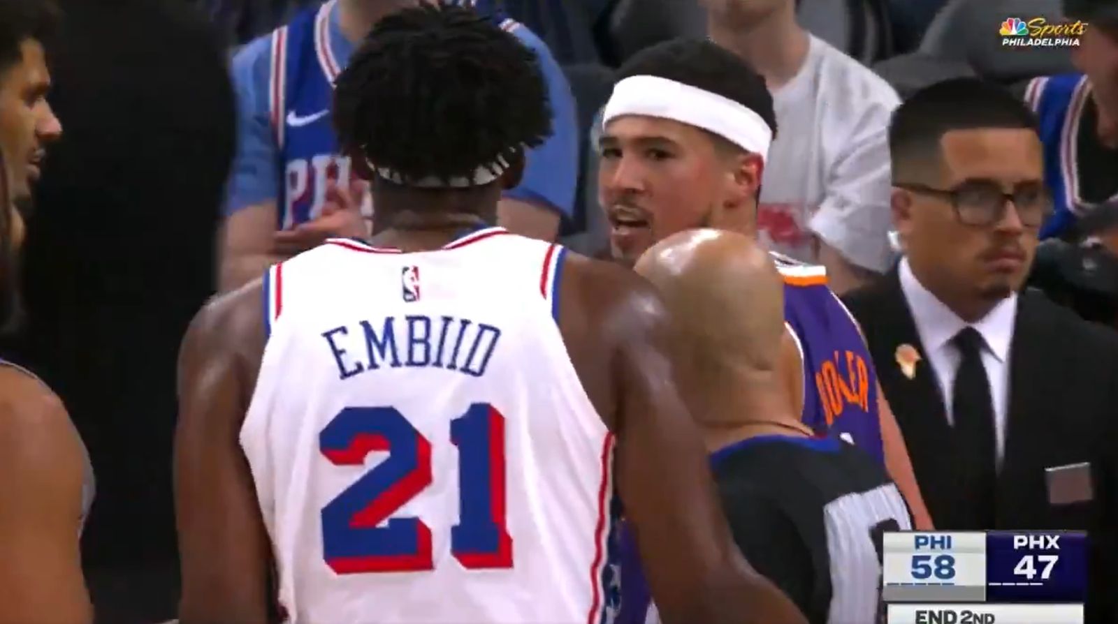 Devin Booker與Joel Embiid雙方於半場結束後爆發口角。圖/截自推特