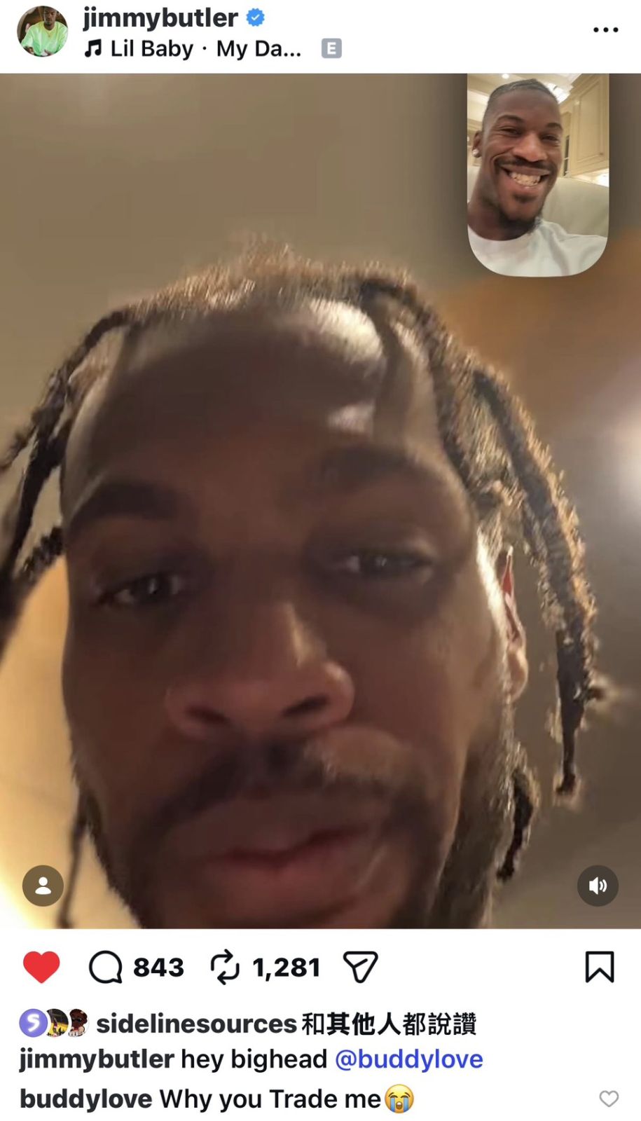 而在今日Jimmy Butler則發佈一則自己與Buddy Hield視訊的照片,Jimmy Butler配文表示「嘿大頭」並標註了Buddy Hield的IG帳號,Buddy Hield也很快回覆表示「你為何把我交易走」搭配哭臉表情。