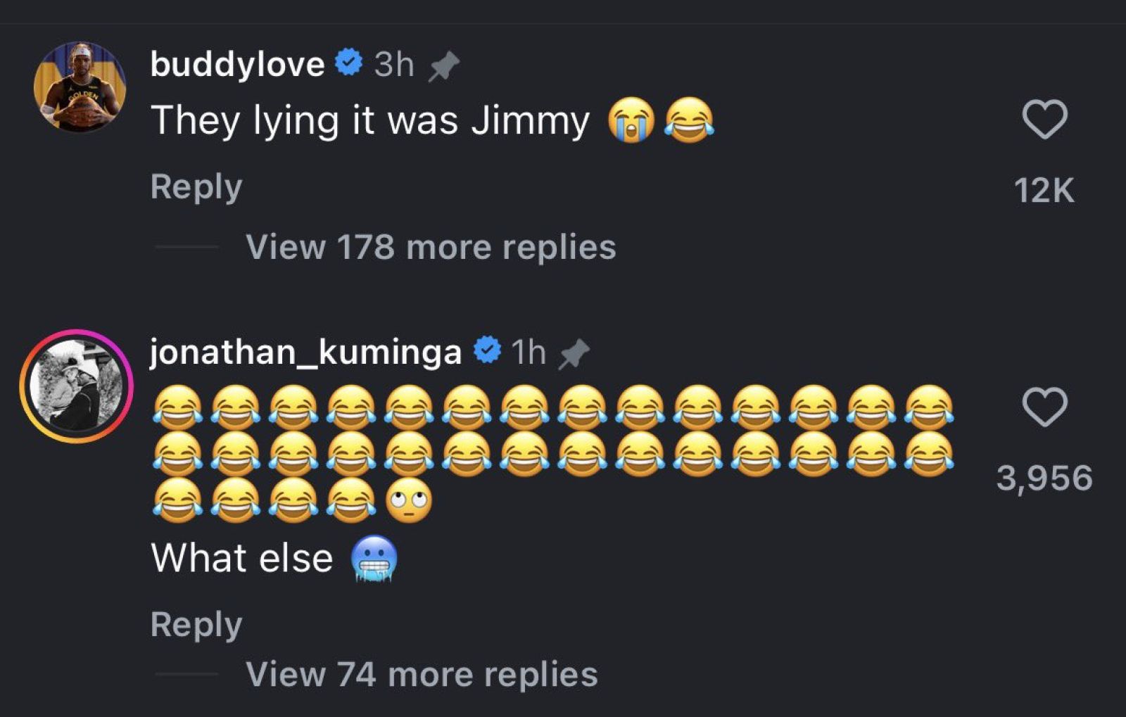 除了Stephen Curry外,一同與Jonathan Kuminga被交易至老鷹的Buddy Hield也在此貼文下留言表示「他們說謊這是Jimmy做的」,吸引了許多網友前去朝聖這群勇士現在與前隊友們之間在Instagram上的有趣互動。