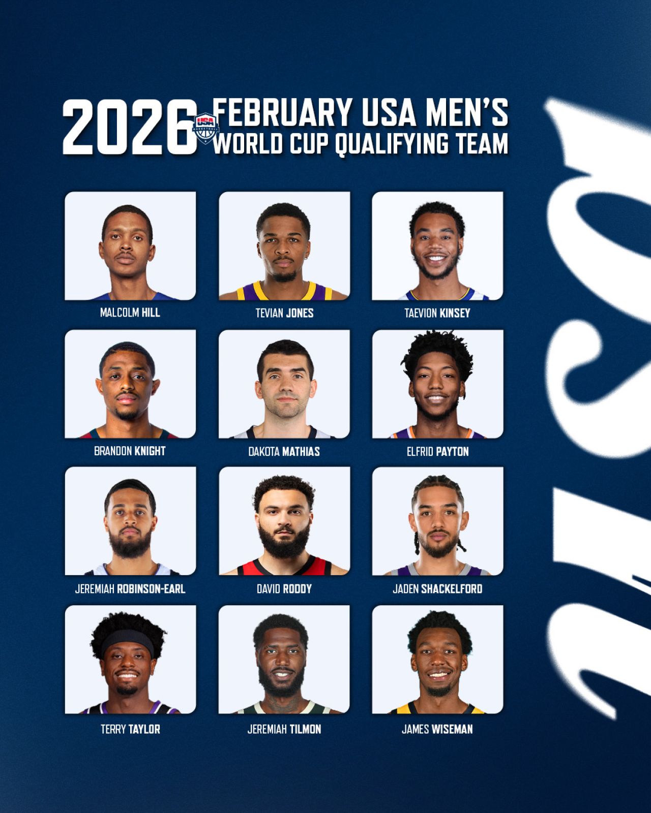 美國男籃今日正式公布2026年2月世界盃資格賽二階段窗口賽事12人名單與教練團,球隊將於2月26日與3月1日在加州歐申賽德的「Frontwave Arena」分別迎戰多明尼加與墨西哥。
