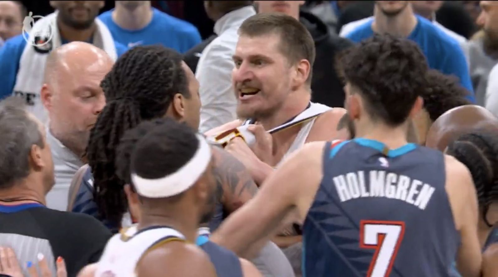 今日雷霆與金塊的末節比賽中,Lu Dort在一次金塊的進攻中絆倒了Nikola Jokic,隨後Jokic上前與Dort理論表達不滿,後續更與Jaylin Williams展開拉扯。