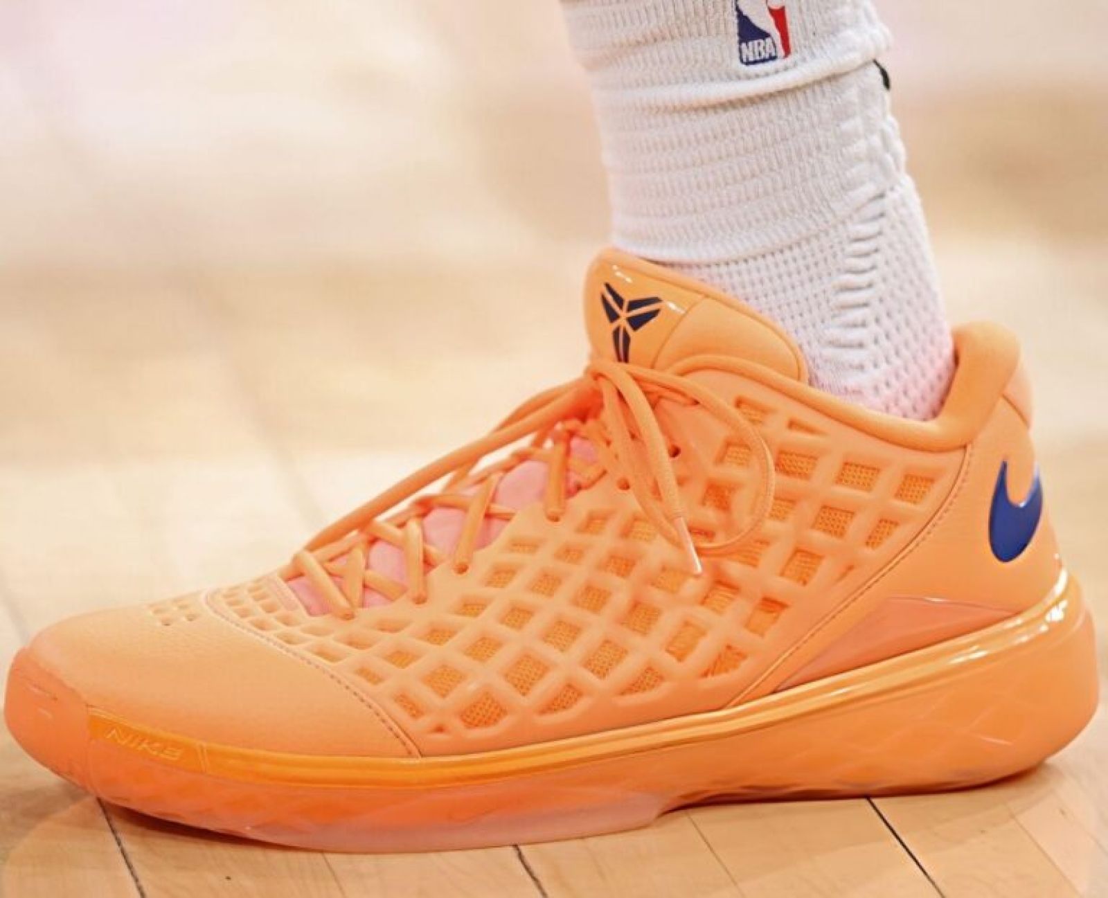 這款配色的官方名稱定為「Arancia」(義大利文的「橘色」),整體外觀完美呼應了尼克隊的經典色彩。鞋身主體披上了極具視覺張力的全橘色調,並在鞋跟處巨大的金屬光澤 Swoosh 標誌以及鞋舌上的 Kobe 武士盾 Logo 點綴深藍色,呈現出原汁原味的紐約風情。