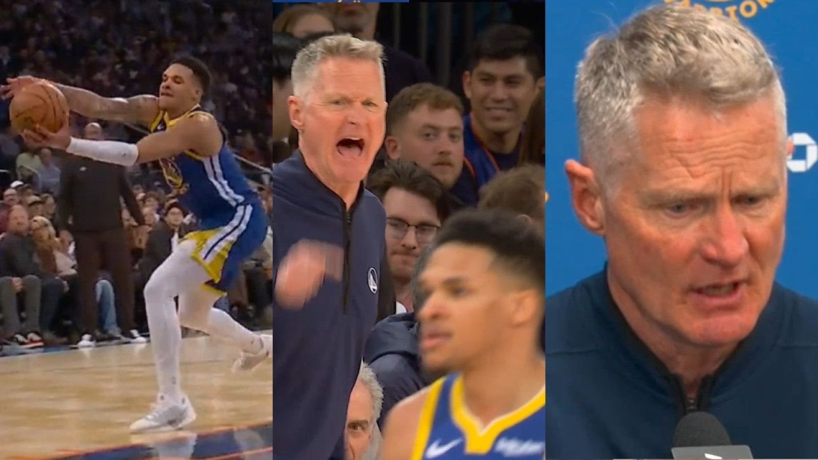 在這次罕見的爆發中,Kerr 在場邊對著 Will Richard 咆哮,隨後尼克隊投進一記三分球,造成了對尼克有利的 5 分來回落差。