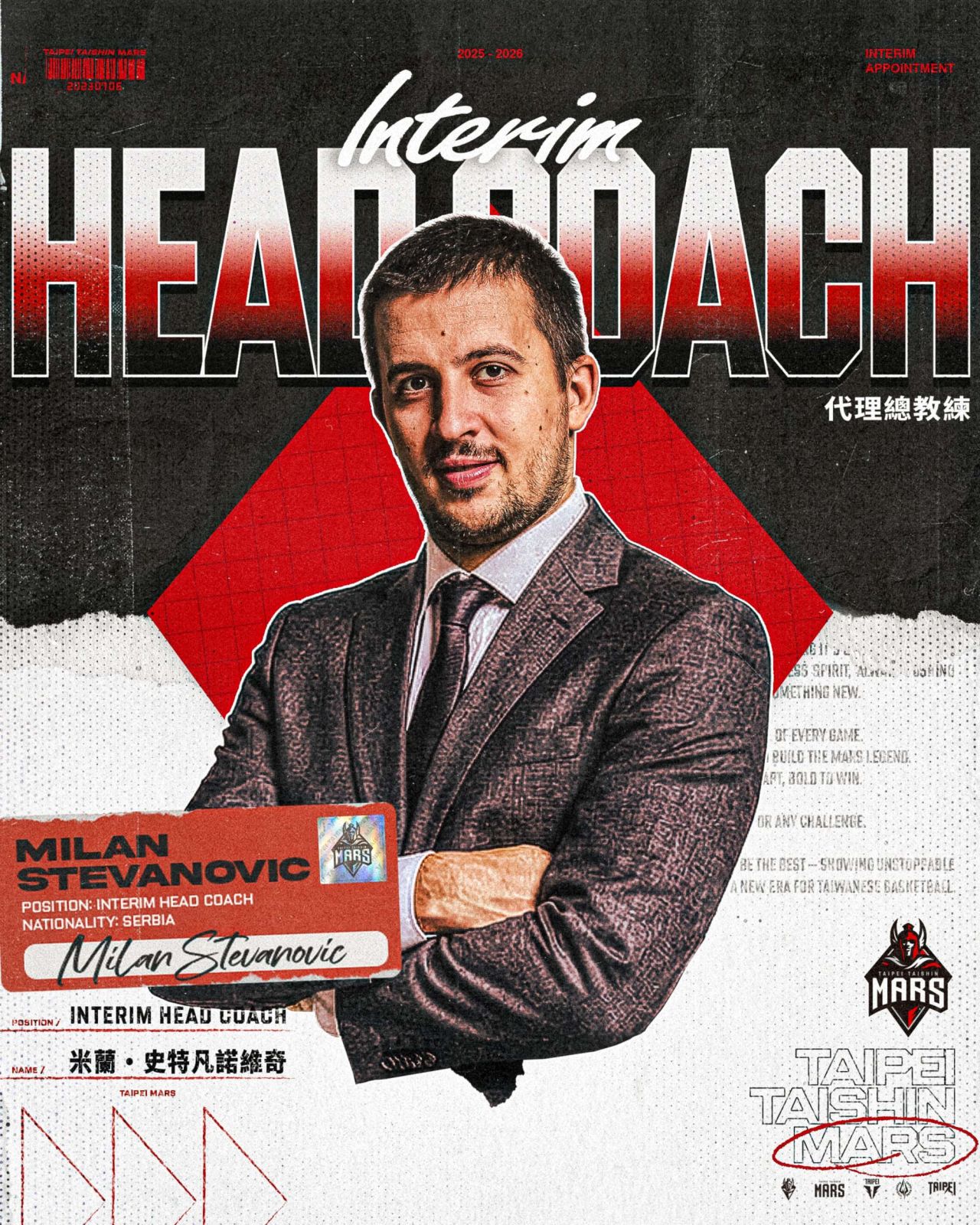 米蘭自戰神首季即加入教練團,至今邁入第三個賽季,對團隊文化與球員特性相當熟悉。台新育樂總經理林祐廷認為,米蘭一路參與球隊發展,對團隊運作充分了解,「相信他能帶領球隊做好調整,維持團隊競爭力。」接任代理總教練的米蘭談到,這是一份肯定也是責任,「我會和教練團與球員一起努力,全力做足準備。」團隊本週持續投入訓練與備戰,專注迎戰週末賽事。