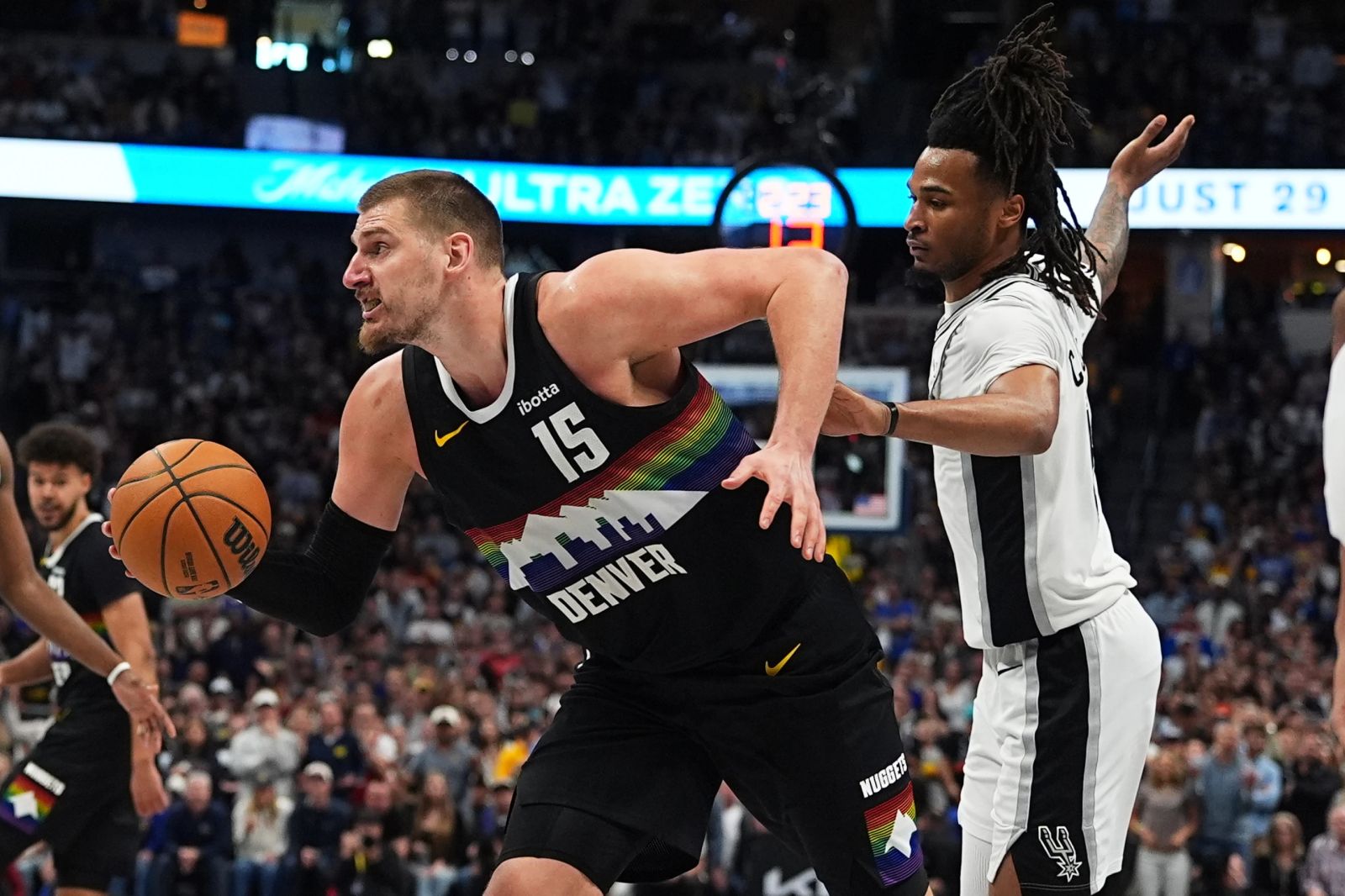 第二節馬刺連得8分將分差重新拉開至兩位數。Jonas Valančiūnas為金塊及時止血,金塊中段打出10-3追至6分差距。Nikola Jokić末段連續得分,在勾手命中後將差距縮小至5分。De’Aaron Fox命中壓哨跳投,馬刺以72-65領先進入下半場。