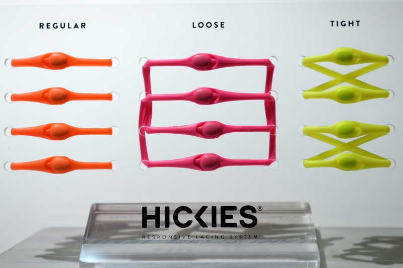Hickies 鞋帶與傳統鞋帶不同,以相較便利的「扣」來取代「繫」的過程,鬆緊度則依照不同的綁法分成三種類型。(左 REGULAR:基本、中 LOOSE:較鬆、右 TIGHT:較緊)