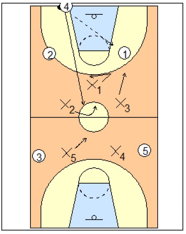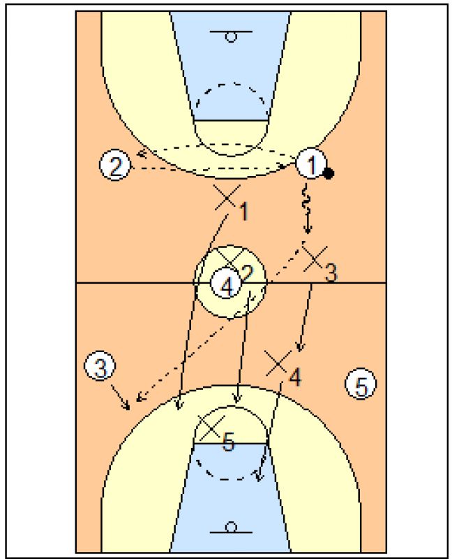 b. 當對方開始這樣做時,這個戰術會進行變化,假裝包夾後趕快退成一對一盯人戰術,並且不給任何三分的進攻機會