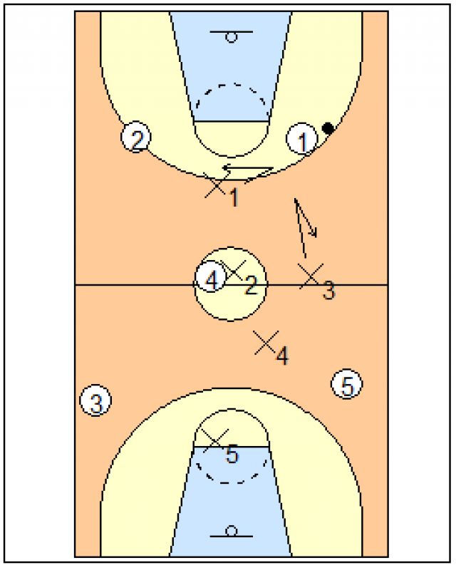 a. 1號把球回傳給2號,X1在他們中間,X2回到球與3號的球線上,但是速度不要太快讓X3有時間回補到中間不讓球傳到中間
