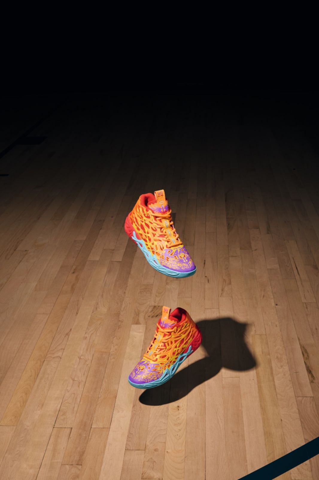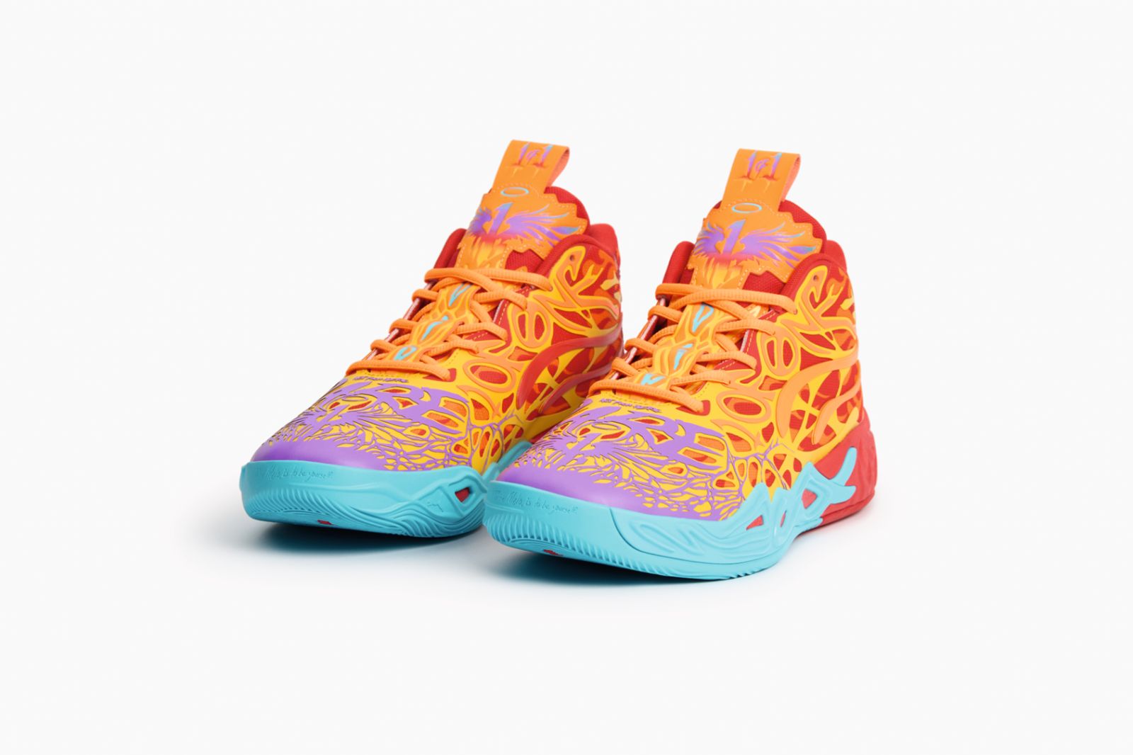 MB.04 Phoenix 火鳳凰象徵著從烈焰中破繭重生,突破球場上的無限可能,這與 LaMelo Ball 持續挑戰巔峰的籃球生涯完美契合。MB.04 Phoenix 鞋款設計上以炙熱紅色為基調,向外漸層疊合亮橙色與金黃色光澤,並於鞋頭處以星空紫結合湖水藍包覆,完整模擬火焰燃燒時的流動感,展現擊破防線的動能與氣勢,也象徵著擁有在球場上突破防線的能量。