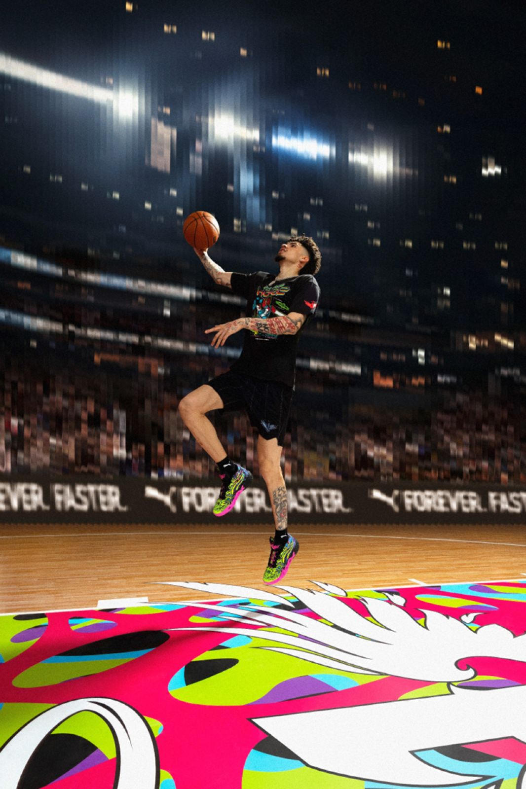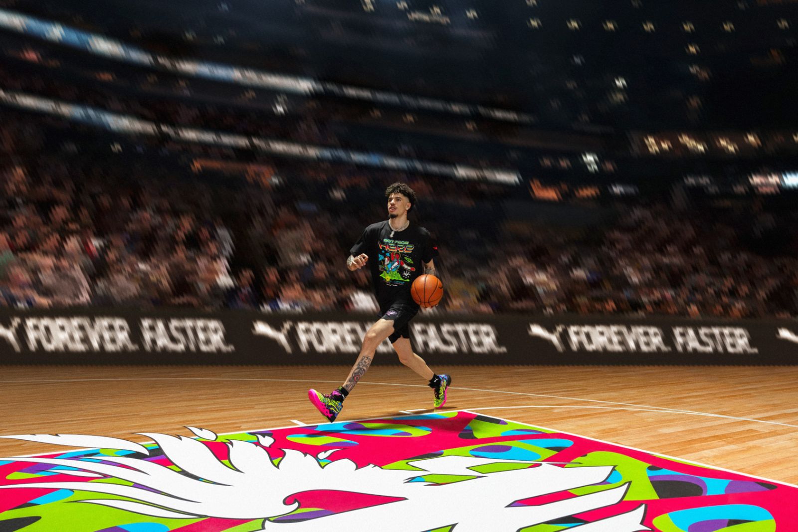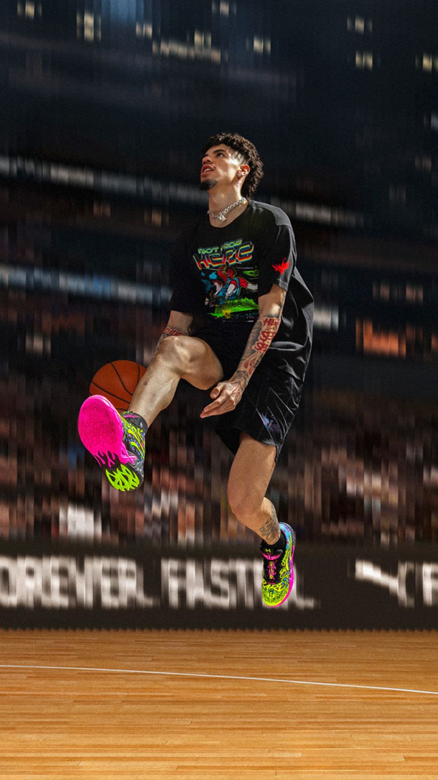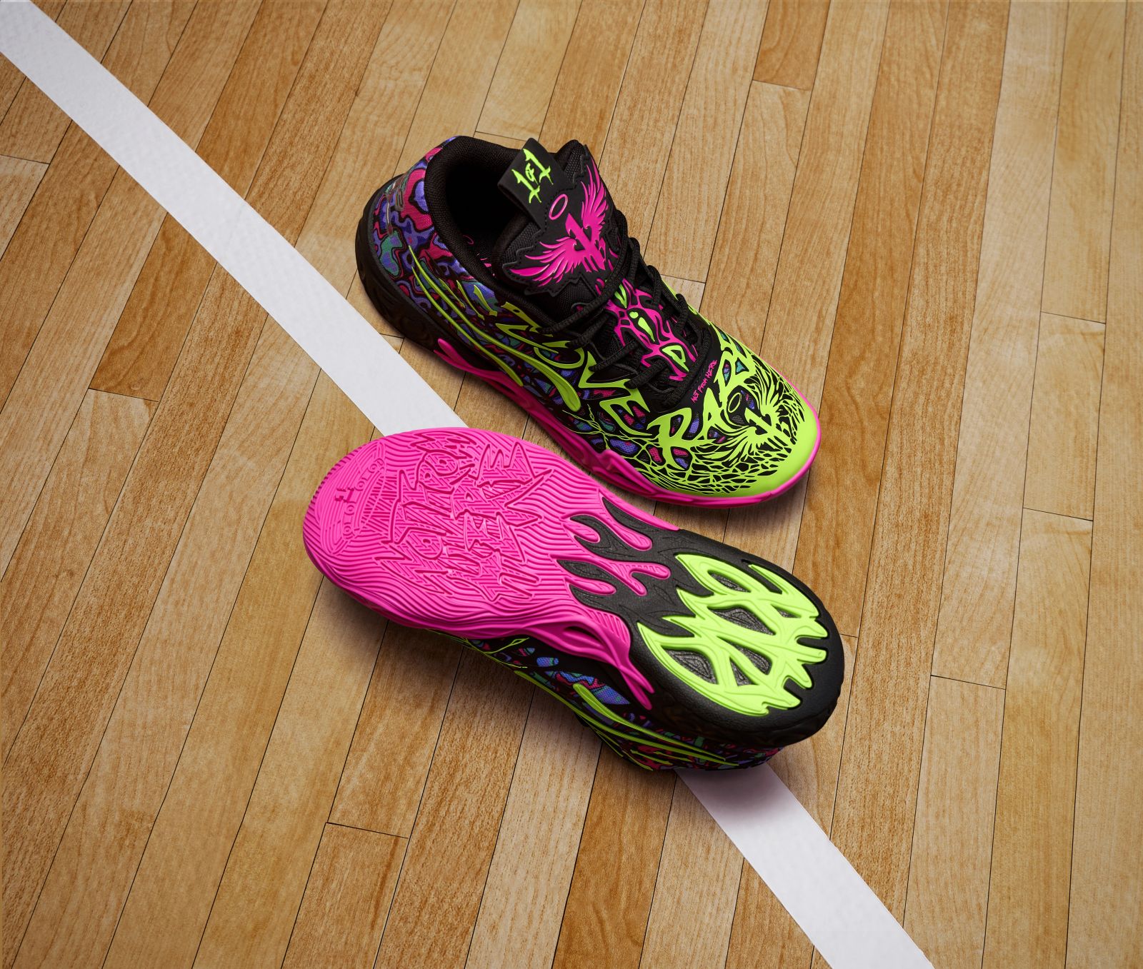 將星際般的黑底鞋面上大膽揮灑草綠色與亮粉色,並加入藍色與紫色,打造出撞色感的高調視覺饗宴,完美展現 LaMelo 的王者風範。MB.04 HEEM 將於 12 月 14 日 (六) 在 PUMA 指定門市與官網亮相,Melo is HEEM!