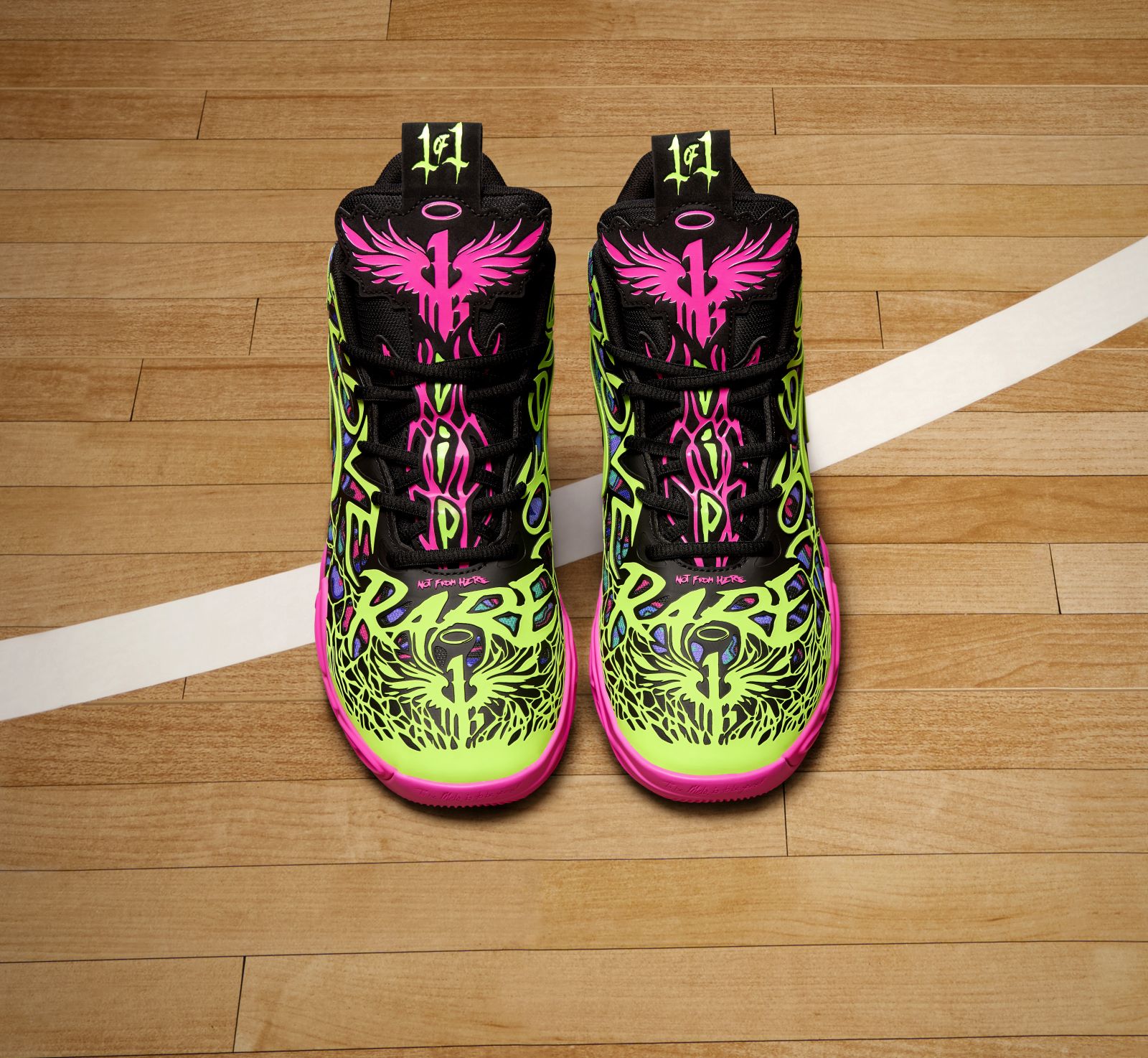 鞋跟處繡上 NOT FROM HERE 並描繪 LaMelo ball 的生動圖樣,傳遞出獨特的個人魅力。透過 5D 列印技術,MB.04 系列有著外星觸手般的立體層次感,LaMelo Ball 的經典標語「1 OF ONE」與「RARE」,強調無懈可擊的球技。搭載 PUMA 獨有的 NITROFOAM™ 氮氣中底科技,揉合專為籃球設計的 PUMAGRIP 橡膠耐磨大底,實現「輕量」與「高緩衝」並存的極致機能,為球場帶來無懈可擊的能量。