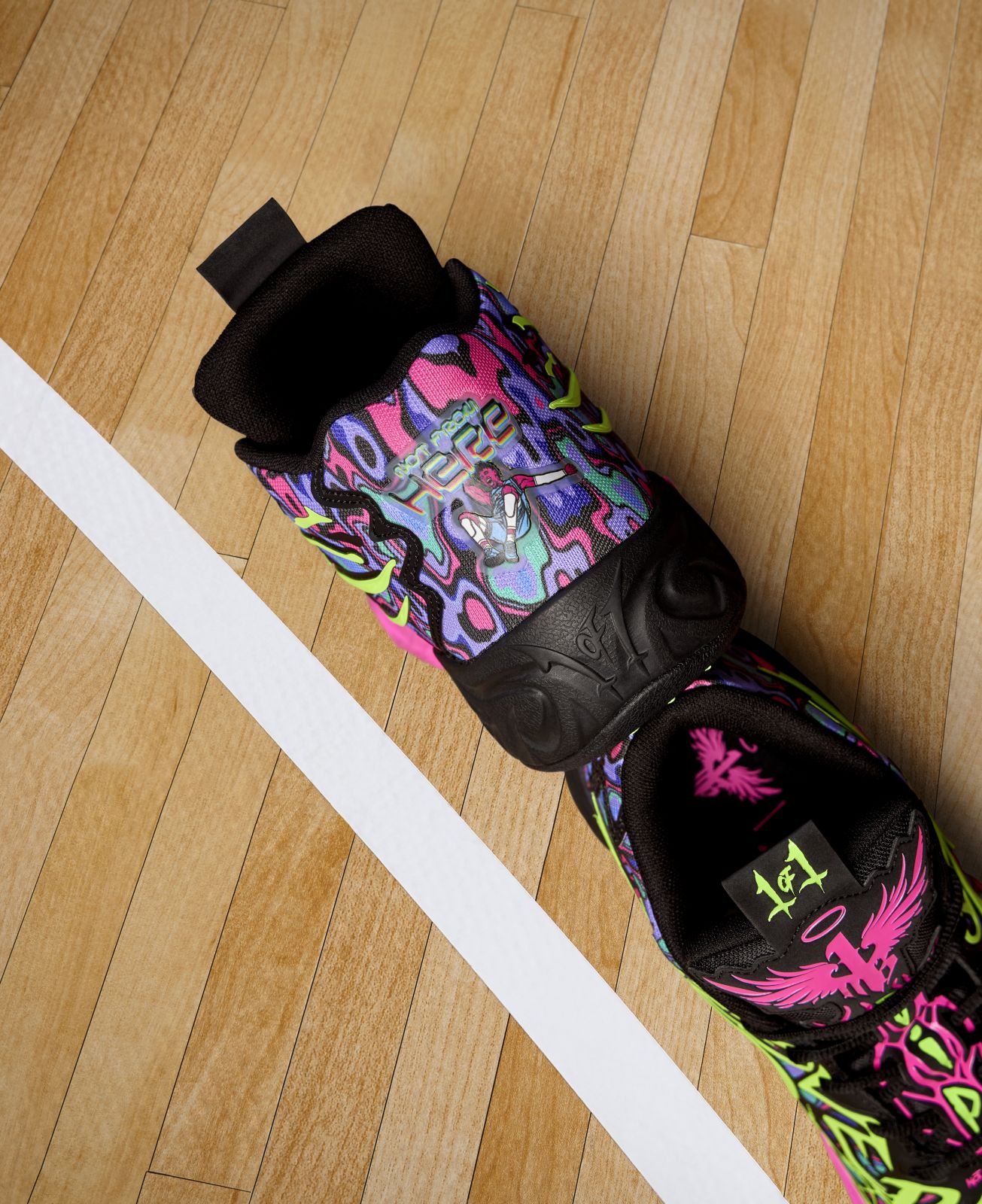 這款全新配色以在星際般的黑底為鞋面基調,將螢光感的草綠色大面積揮灑,象徵著將能量的釋放,並透過亮粉色點綴於鞋底和細節,為設計增添流動感,彷彿能量在每一處細節中流動,最後加入藍色與紫色,呈現出撞色感的高調視覺饗宴,為鞋款注入更多生命力,在創意與時尚之間取得完美的平衡。