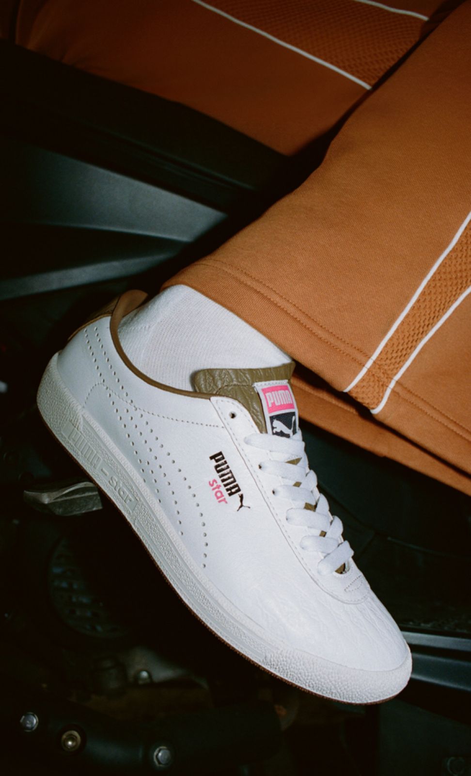 聯名 Star 鞋款以純白為基調,鞋舌與鞋後跟巧妙運用質感棕撞色拼接;左右鞋舌與鞋墊交錯呈現 PUMA LOGO 與聯名標識,彰顯設計小巧思。兩款鞋在穿著體驗上提供卓越舒適性的同時,更個性演繹了街頭型格,盡釋對潮流與質感的雙重追求。