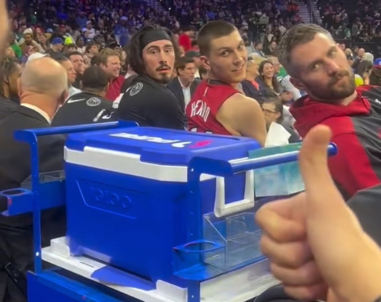 今日Jimmy Butler正式在交易中被送去勇士,而在熱火客場對陣七六人的比賽中,一名熱火球迷坐在熱火板凳席後方和Kevin Love、Tyler Herro、Jamie Jacques Jr.通知了這筆交易的發生。