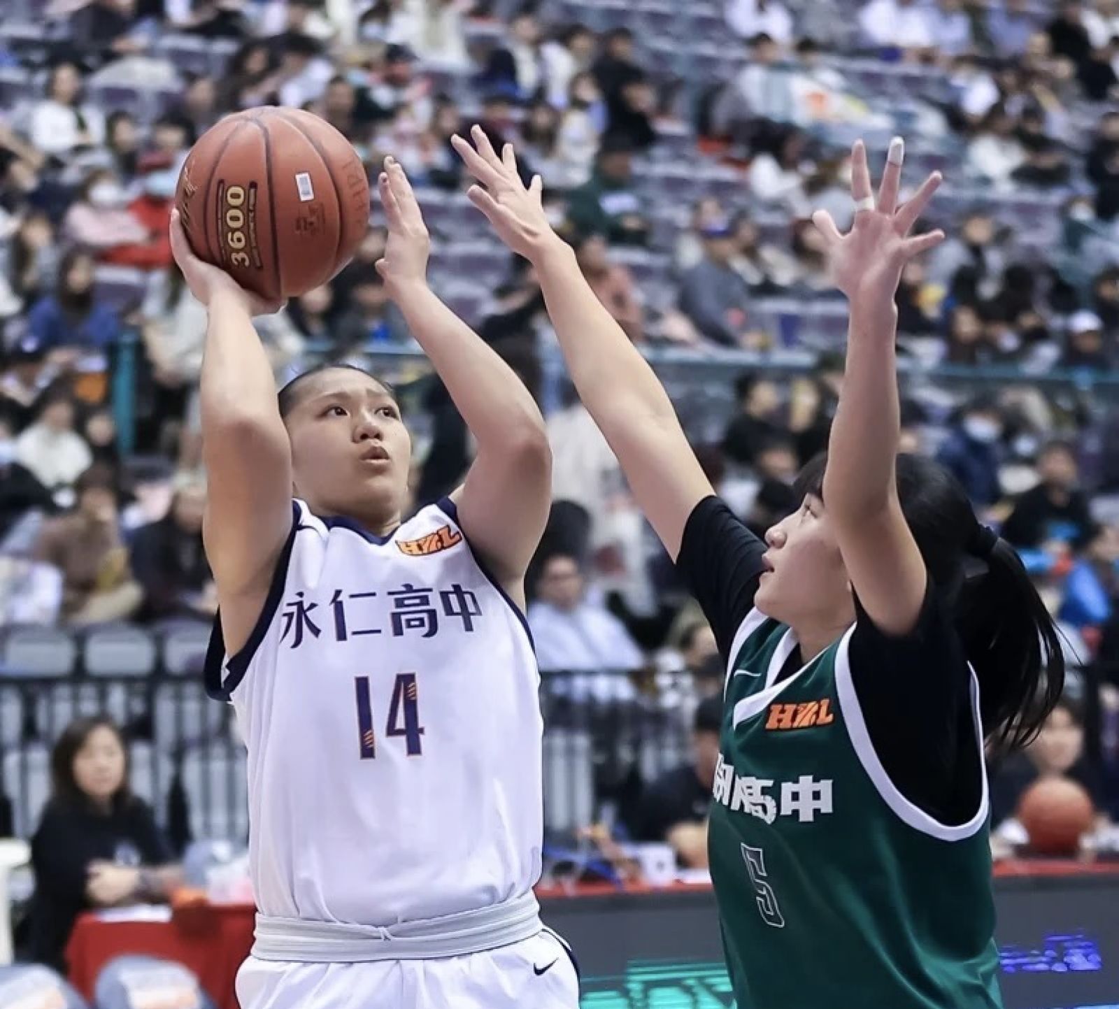 HBL高中籃球聯賽女子組四強賽,永仁高中陳薇涵(左)在中距離跳投得分。記者余承翰/攝影