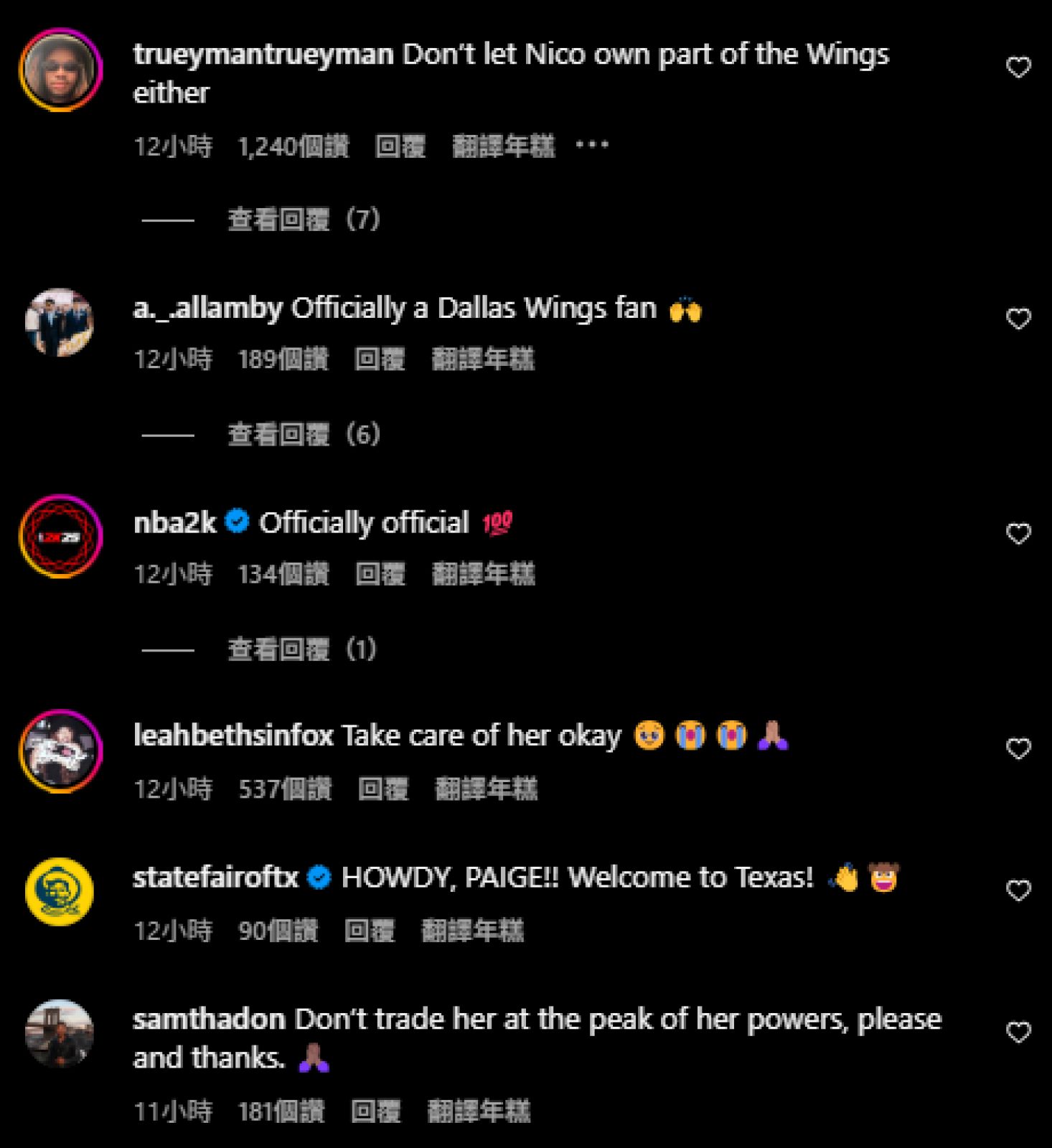 達拉斯飛馬發布球隊以狀元籤選中Paige Bueckers貼文後,也許是受到今年同城的達拉斯獨行俠透過交易送走Luka Doncic的影響,許多網友紛紛在留言區表示「千萬別讓Nico Harrison來插手這對事務」、「拜託把她照顧好」、「不要在她巔峰期的時候把她交易走拜託」、「希望六年後球隊不要交易她」等留言出現。