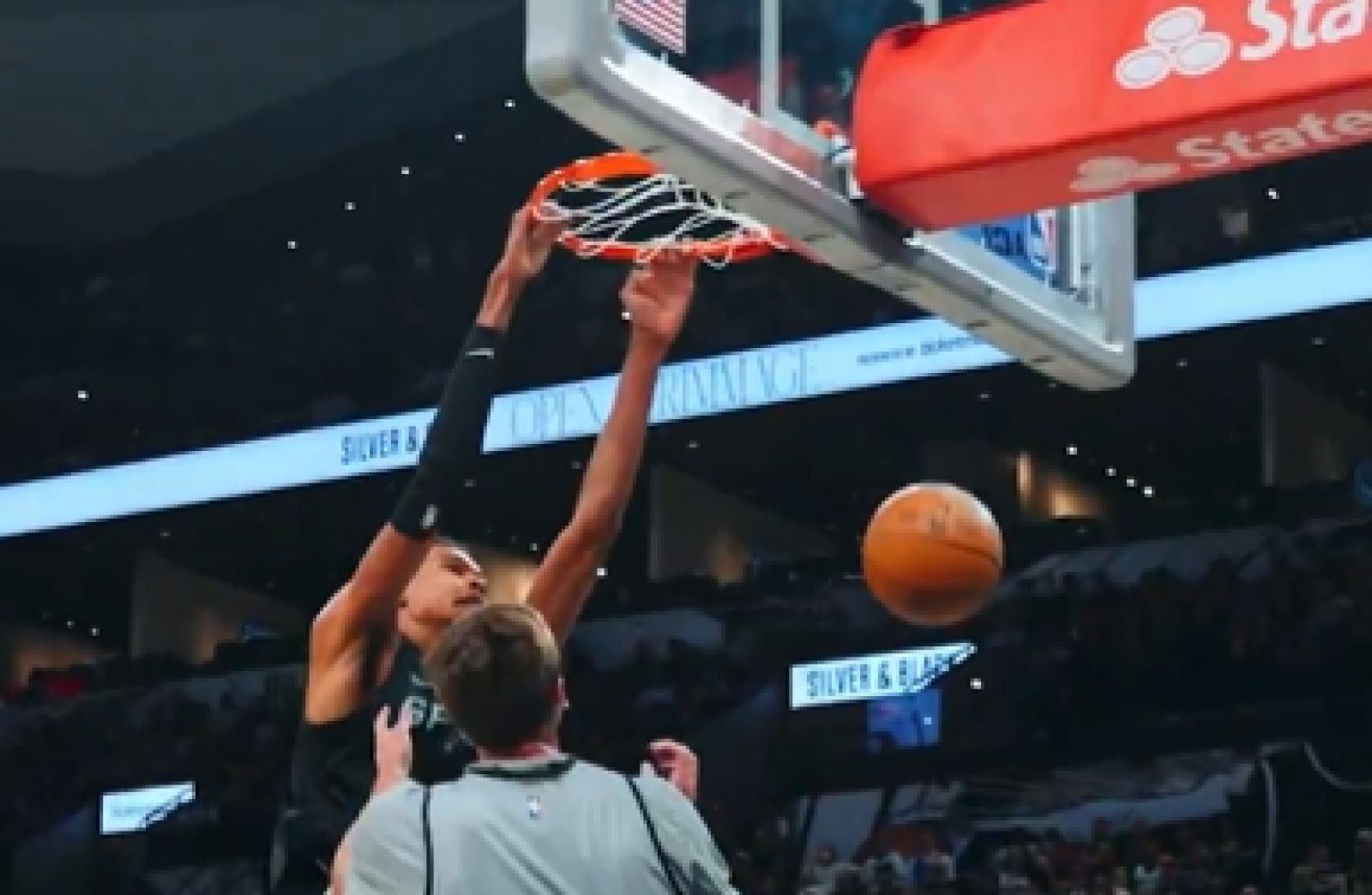 今日馬刺舉辦球迷活動,而在球隊的隊內對抗賽中,Victor Wembanyama在後場持球殺入內線,在面對隊友Luke Kornet的防守下,Wembanyama則用身體直接將Kornet撞開,後續隨即完成雙手灌籃。